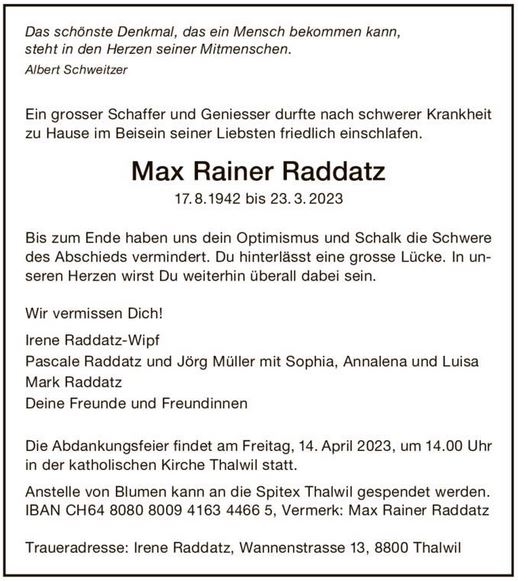 Wir trauern um unseren lieben, immer fröhlichen und humorvollen Max Raddatz. Max war massgeblicher Initiant bei der Gründung unseres Vereins im Jahre 2008, während 9 Jahren unser umsichtiger und allseits beliebter Präsident. Nach seinem Rücktritt als Präsident im Jahre 2016 wurde er zum Ehrenmitglied ernannt. Bis zuletzt war unser "Mäxe" äusserst aktiv und engagiert im Verein, es gab fast keinen Anlass ohne ihn und seine liebe Irene. Auch wir vom Golfclub Thalwil vermissen Dich, lieber Max! |